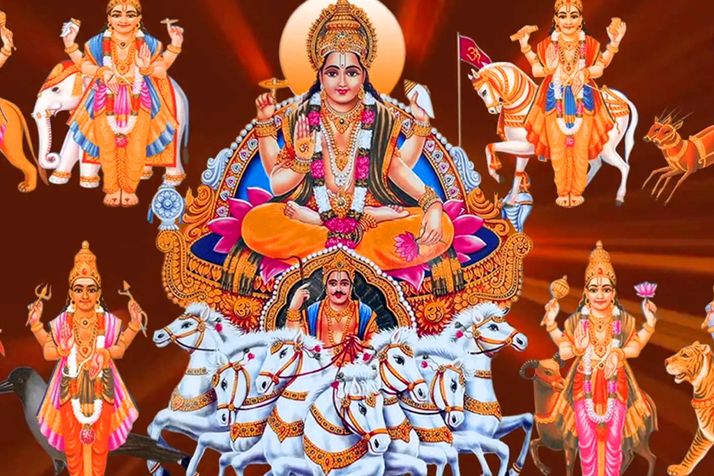 According to Vedas and Shastras there are many planets & stars but only Nine (Nav=9) Planets (Grah) and 27stars that fell into immediate circumference of the solar system and are likely to affect our lives depending upon their position in our natal chart are considered. These nine planets form an orbit called as Navagraha Mandal. The nine "grahas" or planets in our horoscope control our karma, our desires and their outcomes. Each of these nine planets exerts an influence in our lives, which is called "dasa" and it can be known from one's horoscope. Navagraha Shanti pooja is undertaken to reduce the pessimistic effects and improve the optimistic energies related to a person. The nine planets have special kshetras ( place of worship ) in South India. Most of them are concentrated near the Thanjavur district. Navagraha pooja will be helpful, when the concerned planet dasa or sub-dasa is in operation or if the planet is associated with malefics or is in the 3rd, 6th, 8th, or 12th house. Also as said earlier only 9 planets and 27 stars are considered. Within this Navagraha Mandal (the orbit formed by 9 planets) exist seven gods viz: Ganesha, Durga, Vaayu, Aakash, Ashwini, Kshetrapaal and Vaastoshpati. Enclosing this Navagraha Mandal there are another ten gods called Dashadik-Paalak. Enclosing Dashadik-Paalak is the set of lord that signifies our nature, which are classified as Satva Guna , (Kindheartedness) Rajoguna (Obsessive ness)andTamoguna (Rowdiness, Ruthless, Wickedness).